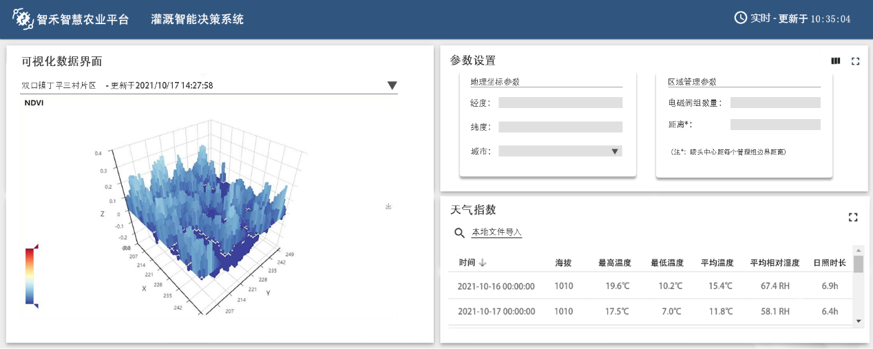 智禾灌溉决策系统提供了数据输入界面,该界面允许用户输入多光谱图像和热红外图像并设置一些基本参数或者通过无人机和灌溉系统的传感器自动获取参数,前端系统其中包括灌溉设备的地理坐标,区域管理参数。